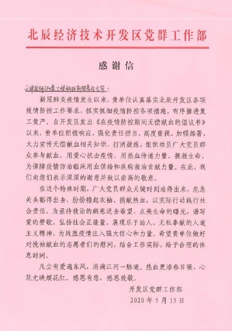 由于我公司在此次獻血活動中的積極表現,北辰經濟技術開發區黨群工作部也向我們公司發來了感謝信。